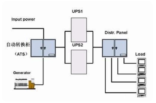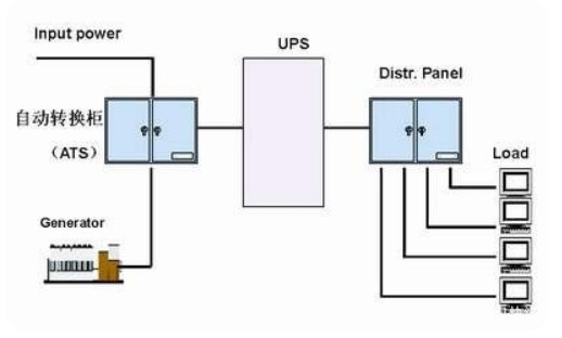 在UPS與發(fā)電機匹配使用中,只需為UPS配置少量后備電池以備切換時使用。發(fā)電機與市電轉換即可以手動,也可以設置自動切換設備(ATS)。當市電出現(xiàn)故障,自動切換設備(ATS)將自動切換到發(fā)電機端,發(fā)電機經(jīng)過一定的時間延遲自動啟動,提供電力保障。